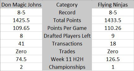 With ESPnis and Flying Ninjas obtaining BYE weeks going into the playoffs. The first round saw matchups of Don Rigz vs Da Egots and Don Magic Johns vs City of Champs Sundays Best. The first matchup once again showcased the strength of the early GG with Don Rigz advancing with his ragtag group of brothers over Da Egots who was dealt with crucial injuries to Alshon Jeffrey and Miles Sanders during the monday finale. Final Score 110.5 - 91.5. Don Magic Johns showcased the overall strength of his team beating City of Champs Sundays best 124 - 70 while surviving a potential comeback against Russell Wilson, Todd Gurley, Cooper Kupp and Greg Zuerlein. Keeping the hope of a championship match between two Dons alive. The semi-finals saw the highest of highs and lowest of lows when it comes to playing fantasy football. Not even an early GG could save Don Rigz as Flying Ninjas went off to a hot start on Thursday night when Lamar Jackson, Mark Ingram and Lev Bell put up combined 67.5 points. Flying Ninjas never looked back as he advanced to his second championship match in 3 years. The second semi-final match between Don Magic Johns and ESPnis saw how cruel and unforgiving fantasy football can be as a last minute substitution of OBJ in place of Kenyan Drake cost ESPnis big time. Drake put up 37.5 fantasy points on the bench while OBJ only scored 10. Don Magic Johns wins 140.5 - 112. The championship match will feature our two highest scoring teams Don Magic Johns and Flying Ninjas. To preview the Championship match, Let's hear from both of the managers.