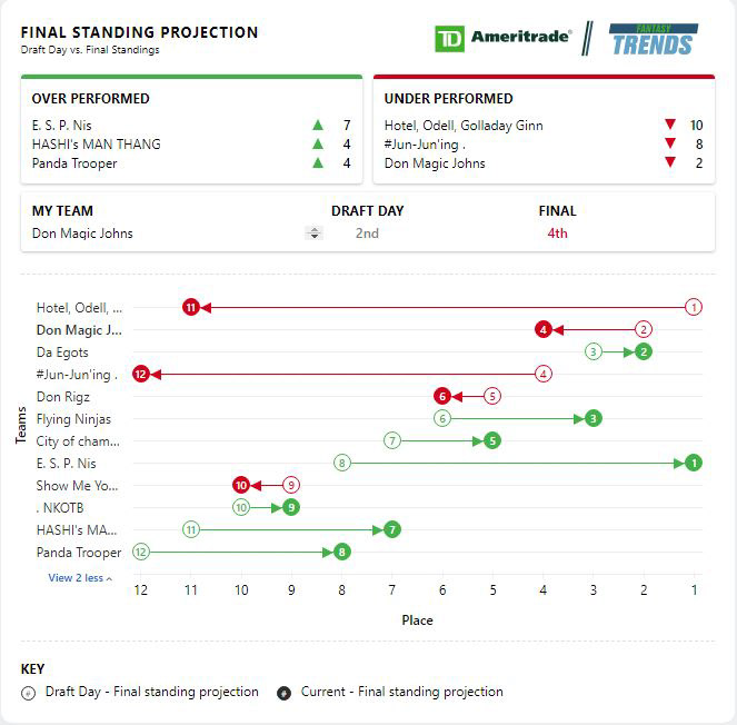 The West division saw long time favorite and everyone's best friend Jun Juning struggled early and often with injuries to Saquon Barkley, Kerryon Johnson, Cam Newton and TY Hilton. Jun Juning could not recover form the injury bug as he finished last in the West and will have to wait til next year to try an obtain the elusive championship. Hashis Man Thang also suffered through injuries most of the year to David Johnson and Greg Olsen and failed to make the playoffs. NKOTB made a late run with studs Michael Thomas and Austin Ekeler but fell just short this year. NKOTB has now failed to make the playoffs after winning it all in his rookie season. Don Rigz or should I say Christian McCaffrey was able to secure a playoff spot despite Antonio Brown and having the second lowest amount of points scored with some savvy waiver wire moves, a true bargain hunter. City of Champs Sundays Best looked to be one of the stronger teams heading into the playoffs after a late season trade saw him acquire WR stud Chris Godwin via trade to join his elite WR squad of Cooper Kupp and DJ Moore. The number 1 seed and bye week of the East went to the Flying Ninjas who is looking to ride #1 RB Lamar Jackson and Big Truss Mark Ingram to a championship victory. Check below for ESPN's draft day projections vs final standings chart.